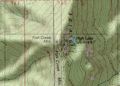 Once on the road proceed north about a third of a mile to a fork in the road. The trail head lost to the road closures is at the junction rising up the ridge between the two roads. From here onwards the trail is easy to follow. The High Lake junction is in a saddle between the two summits 2.35 miles from the trailhead. It is a half mile down to the lake. A descent of a little over 300′ in elevation. The trail to the summit is seriously brushed in at places. Down to High Lake the route is also brushy in places. High Lake has two nice camp sites. Be careful over the large log on the way to the east shore camp. We used to walk it for years, but the bark has recently begun to slip away.