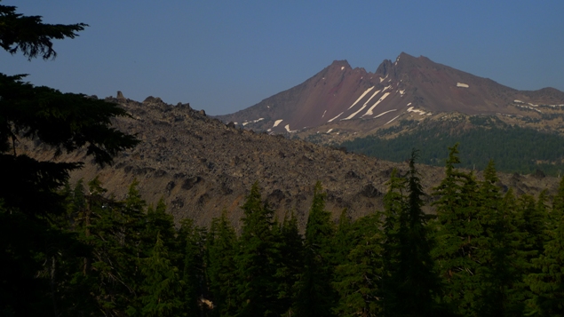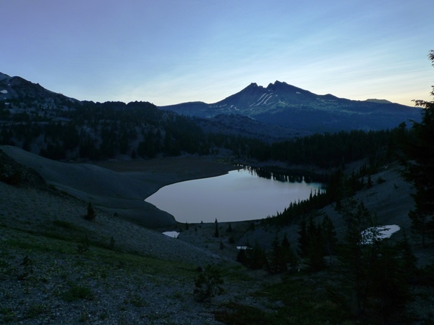 We traveled 2.5 miles, arriving at Moraine Lake at 5:25. I maintained lead position, followed by Grunt, Chef, and Mr. Picky. The detour would add about 2 miles to our trip, but was well worth it with sunny, although chilly weather from a strong breeze. The lake is surrounded on the nearby ridge by many campsites, most of which were occupied. We camped above the lake in a spot with a great view of South Sister and Broken Top from a slight walk up a hill. Given the layout of the trail/campsites, you had to walk through one campsite to get to the next, which made it a non-private affair. This included a motley crew; someone had used a tree next to our site for a bear hang which was over-the-top for an area with 20+ groups nearby.