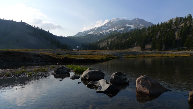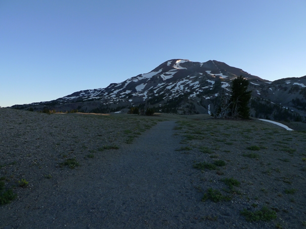 We departed the trailhead at 4:09pm. The first portion of the climb travels through the trees and steadily climbs to an altitude of 6,700 feet at the cut-off to Moraine Lake. There are several points along the first mile of the trail where one can fill up on water. I decided to pass at this point, as I was carrying 4 liters of water, although I soon found that the water in my Nalgene canteen was foul from soap residue. The contents were pitched the contents in a nearby bush, reducing my weight by 2 lbs.