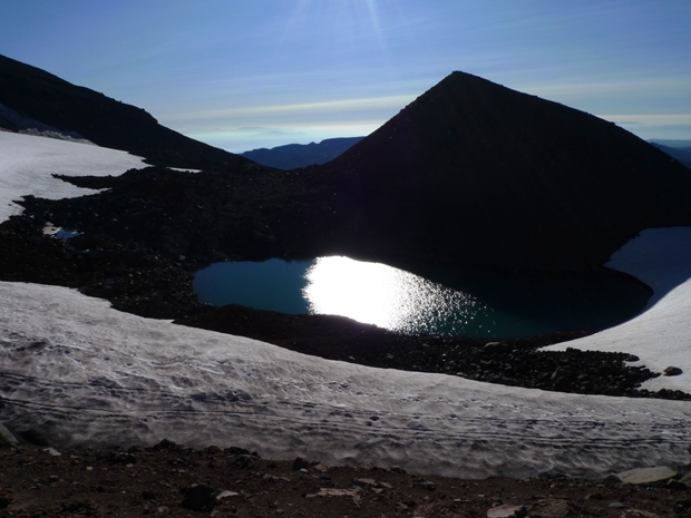 At 8:04am, we hit the lake that forms at the base of the Lewis glacier (~8,850 feet). It was a beautiful green-blue color with trails leading to it in the snow worn from people enjoying this summer swimming hole.