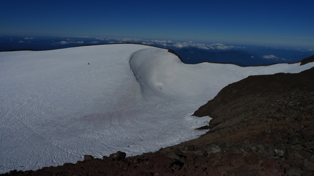 I hit the water hard as I was somewhat dehydrated from the night before. Once we climbed out from the lake basin, the trail became very wide as it crossed the plateau, gradually descending until it started its steep ascent to the summit. The volcanic rock on the trail was a mix of sand and coarse pumice. Over the course of the climb, the scree ate through the understrap on one of my gaiters. The pitch was steep and, at times, precarious, due to the nature of the trail, with scree strewn over the rock substrate and we had to choose our steps carefully.